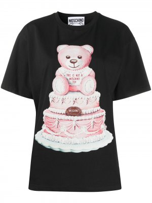 Принт с изображением плюшевого медведя, принт с логотипом на груди, круглый вырез, короткие рукава и прямой подол. Цвет: черный.