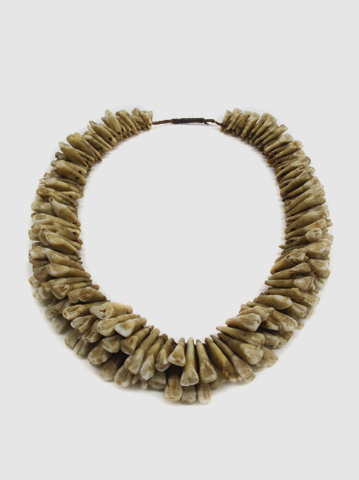 В этом ожерелье собрано 203 (!) зуба. Только два вида зубов использовалось в дизайне – резцы и клыки, поэтому предположительно на создание ожерелья потребовались зубы по крайней мере 60 человек (а скорее всего их было около ста). Каждый зуб был аккуратненько удалён с корнями, в которых затем были сделаны отверстия для нити. Вобщем, впечатляющая работа!
