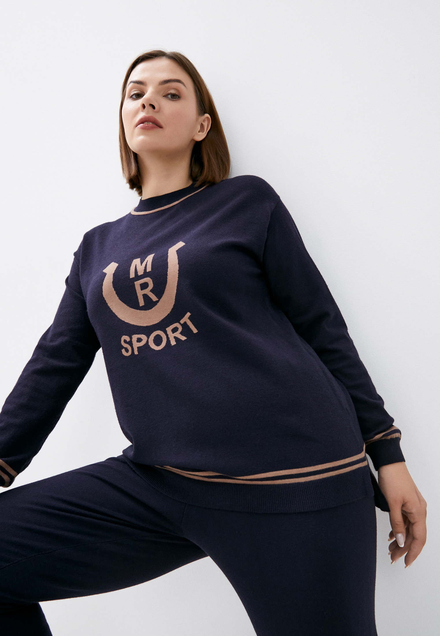 Другой конец спектра Marina Rinaldi коллекция «Sport» — трикотаж, меховые кардиганы, стильные двухцветные пиджаки.