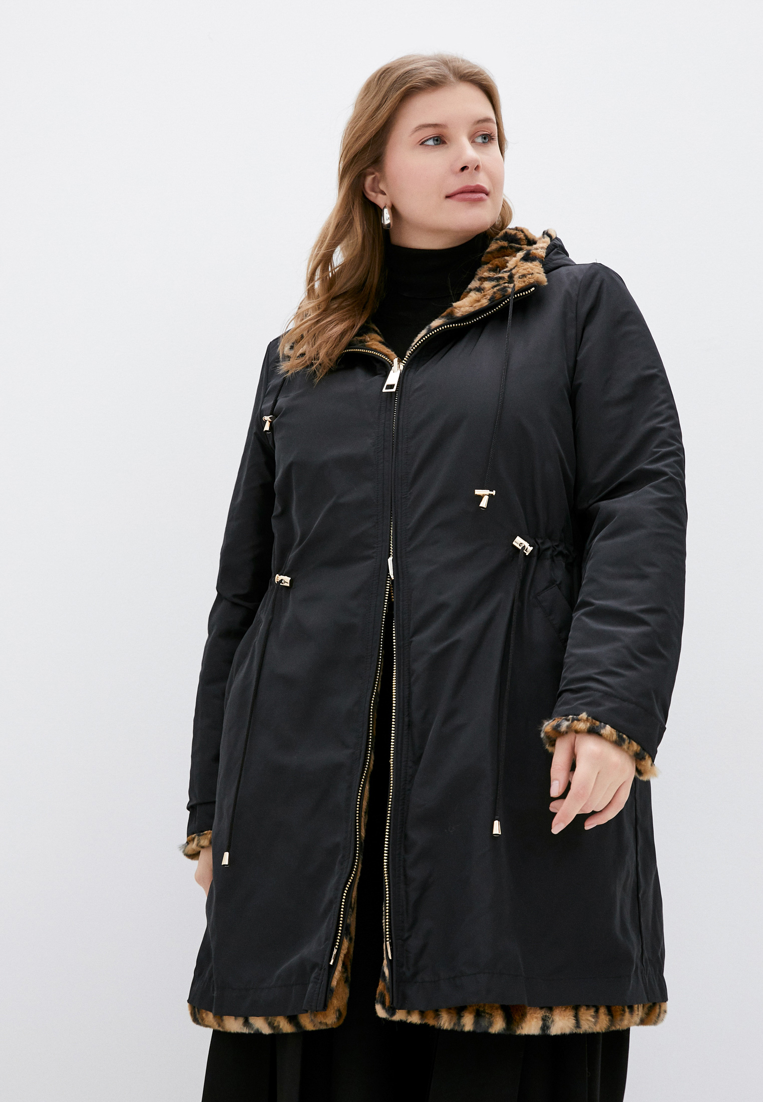 Шуба-парка выполнена из искусственного меха и водонепромокаемого текстиля. Особенности: застежка-молния, утягивающая кулиска по.