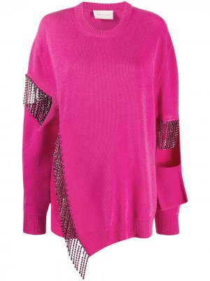 Круглый вырез под горло в рубчик, длинные рукава, украшение из кристаллов, отделка цепочкой, украшение из кристаллов и асимметричный подол.