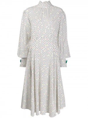 Горловина на ленточной завязке, длинные широкие рукава, манжеты на пуговицах, прорезь на спине, застежка на молнии сзади, узор в горох и асимметричный подол. Цвет: белый.
