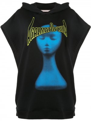 Капюшон, принт спереди, узор сзади, модель без рукавов, прямой подол и свободный крой.