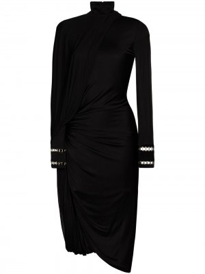 Высокий воротник, драпированная юбка, длинные рукава, вырезные детали, цепочка и асимметричный подол. Цвет: черный.