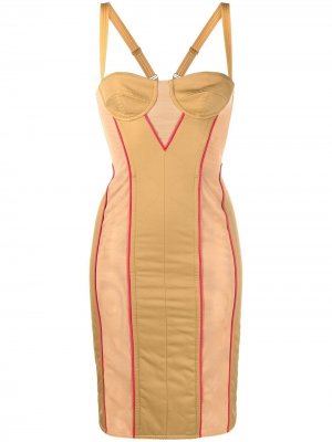 Pale biscuit corset-style mesh minidress from BURBERRY featuring panelled design, mesh detailing, adjustable spaghetti straps, rear zip fastening, stretch-design and moulded cup.