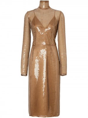 Высокий воротник, сетка, пайетки, длинные рукава, приталенный силуэт, длина миди и шлица по центру сзади.