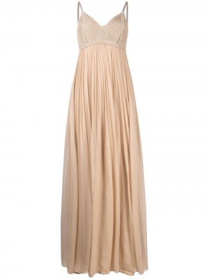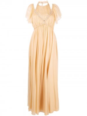 Плиссированная модель, вставки с оборками, плетеный ремень, вырез-петля халтер, вырезные детали, застежка на крючок сзади, открытая спина, расклешенные рукава, ампирный силуэт и длина макси.