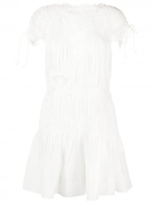 Вышивка, рукава с завязками, короткие рукава, расклешенный крой и застежка на завязке сзади. Цвет: белый.