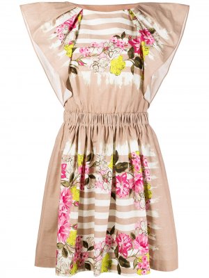 Цветочный принт, узор в горизонтальную полоску, вырез-лодочка, эластичный пояс, дизайн со сборками и длина до бедер.