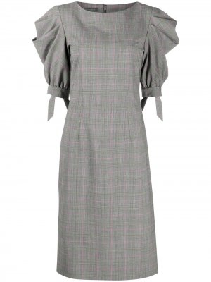 Принт в клетку, круглый вырез, застежка на молнии сзади, короткие объемные рукава, завязки по бокам, дизайн со сборками и длина миди.