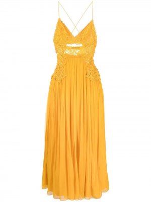 Вышивка, прозрачные вставки, тонкие бретели, перекрестные ремешки, V-образный вырез и длина миди.