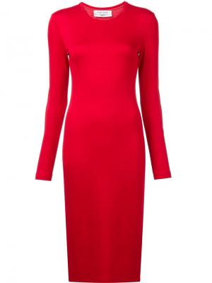 Трикотажное платье Prabal Gurung с полупрозрачными вставками из трикотажа с текстурой пчелиных сот и однотонными полосками, придающими изделию соблазнительный вид. Округлый вырез отделан окантовкой, закатанный.