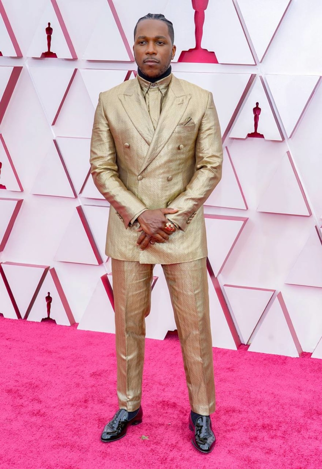 И снова Valentino Haute Couture, только на этот раз золотой, на Кэри Маллиган. Золотой — безусловный фаворит этого года. Лесли Одом-младший вообще появился в костюме Brioni, для создания которого использовали нити из 24-каратного золота (дорого-богато). Приз зрительских (и наших) симпатий достается золотым кроксам музыканта Questlove.