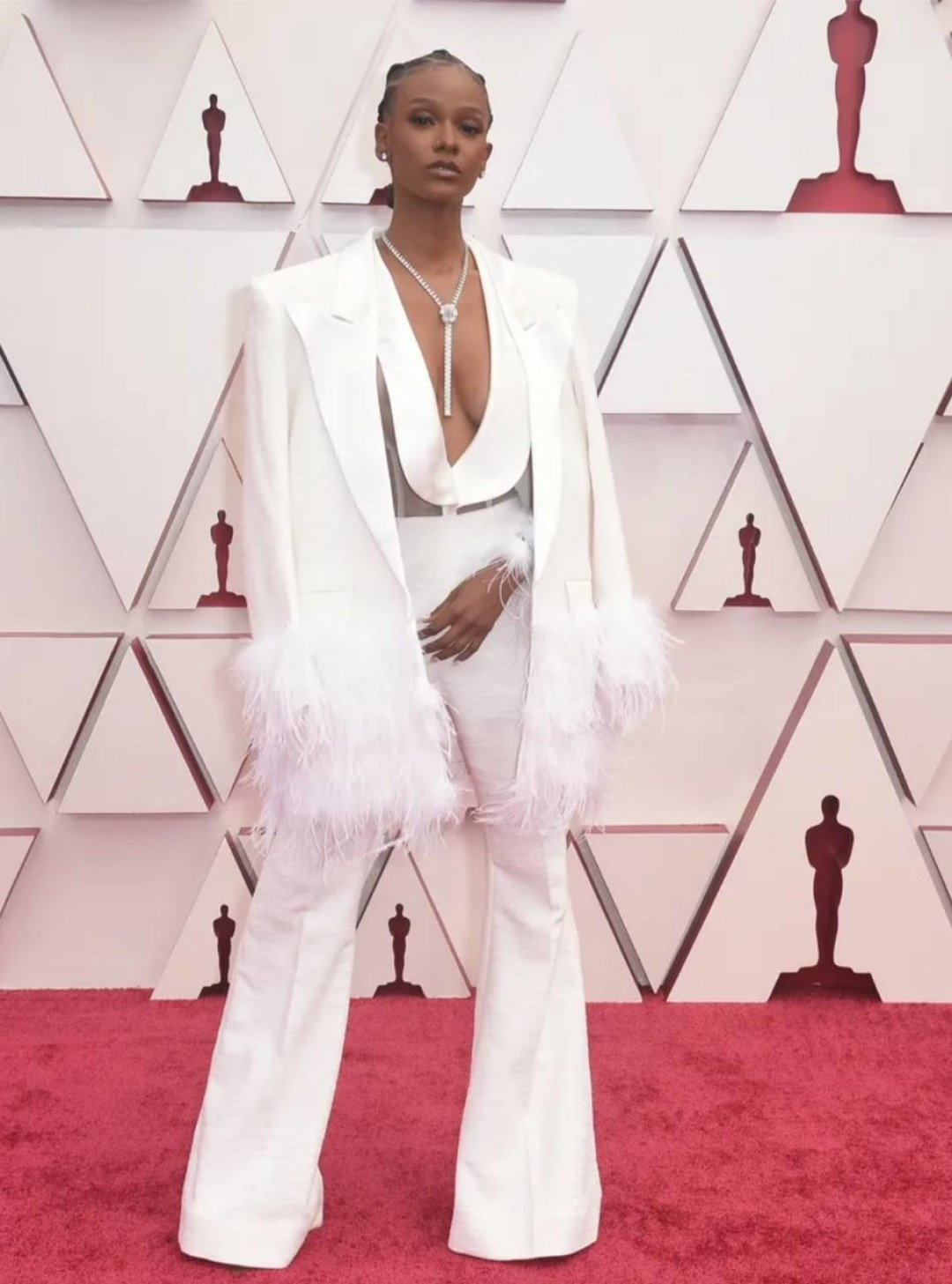 Главные цвета «Оскара»-2021 — белый, золотой и красный. Белый был представлен как платьями, так и костюмами. Отличный пример того, как и какой белый костюм носить, подала композитор Дайан Уоррен. Она появилась на церемонии в образе Valentino (дополнив костюм блестящей водолазкой) из последней кутюрной коллекции модного дома.