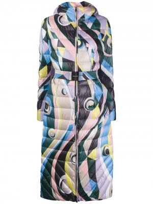 (Эмилио Пуччи). Капюшон, застежка на молнии спереди, длинные рукава, ремень на талии, боковые карманы, абстрактный принт и обитая внутренняя сторона.