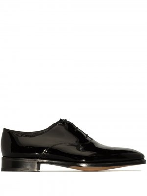 Заостренный носок, шнуровка спереди, глянцевая фактура, низкий блочный каблук и кожаная стелька с логотипом. Цвет: черный.