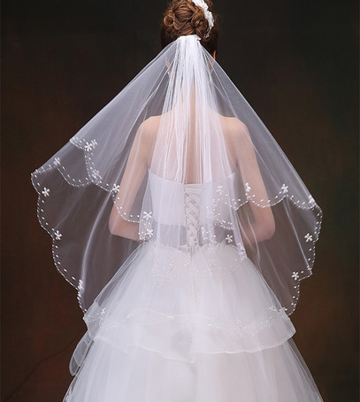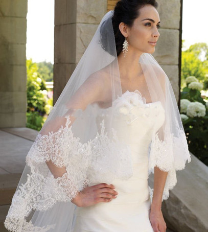 Наиболее распространенный тип фаты длиною около 80 см. Она абсолютно не мешает невесте в свадебный день, а благодаря красиво оформленному краю является прекрасным дополнением к платью.