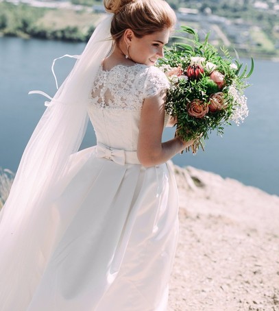 Нередко наряд и образ невесты выбирают исходя из общего стиля свадьбы. К примеру, бохо или рустик характеризуется наличием обилия живых цветов в оформлении. Поэтому не удивительно, что свадебный образ невесты в таком случае будет особенно нежным. Легкая укладка с локонами, элементами плетения и цветочными украшениями — лучшее решение, которое только можно придумать. В свою очередь, фата может быть не только лаконичной, но и с небольшими кружевными вставками.