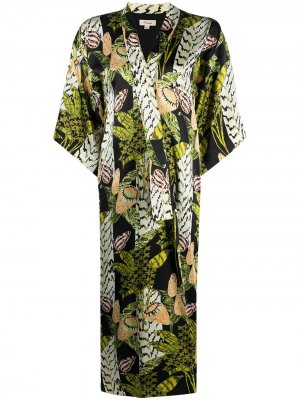Принт с изображением листьев, лацканы-шалька, рукава три четверти, длина до середины голени и цельная подкладка. Цвет: разноцветный.