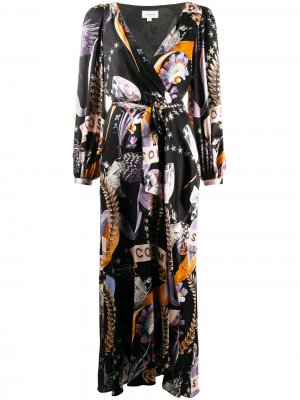 Абстрактный принт, высокий воротник, длинные рукава, эластичный пояс и расклешенная юбка.