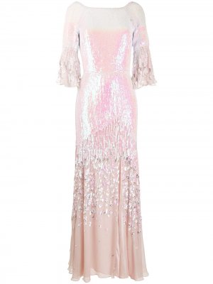 Вышивка, открытые плечи и длинные рукава. Цвет: розовый.