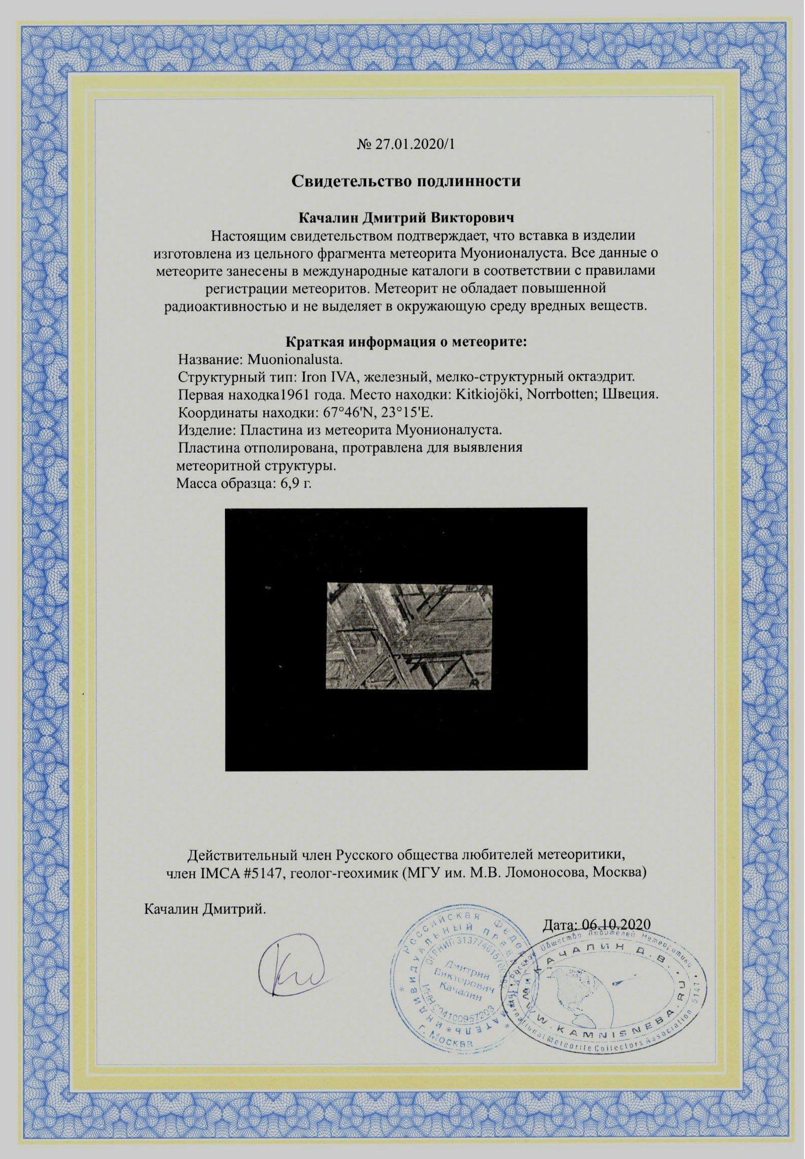 А как я могу понять что это действительно метеорит? Сомневаетесь? Тогда мы предлагаем Вам бесплатно оформить сертификат подлинности от компании “Камни с неба” с печатью индивидуального предпринимателя и подписью Качалина Дмитрия, геолога-геохимика МГУ им М.В. Ломоносова, члена общественной организации содействия развитию метеоритики «Русское общество Любителей метеоритики РОЛМ», члена международной ассоциации коллекционеров метеоритов IMCA #5147.