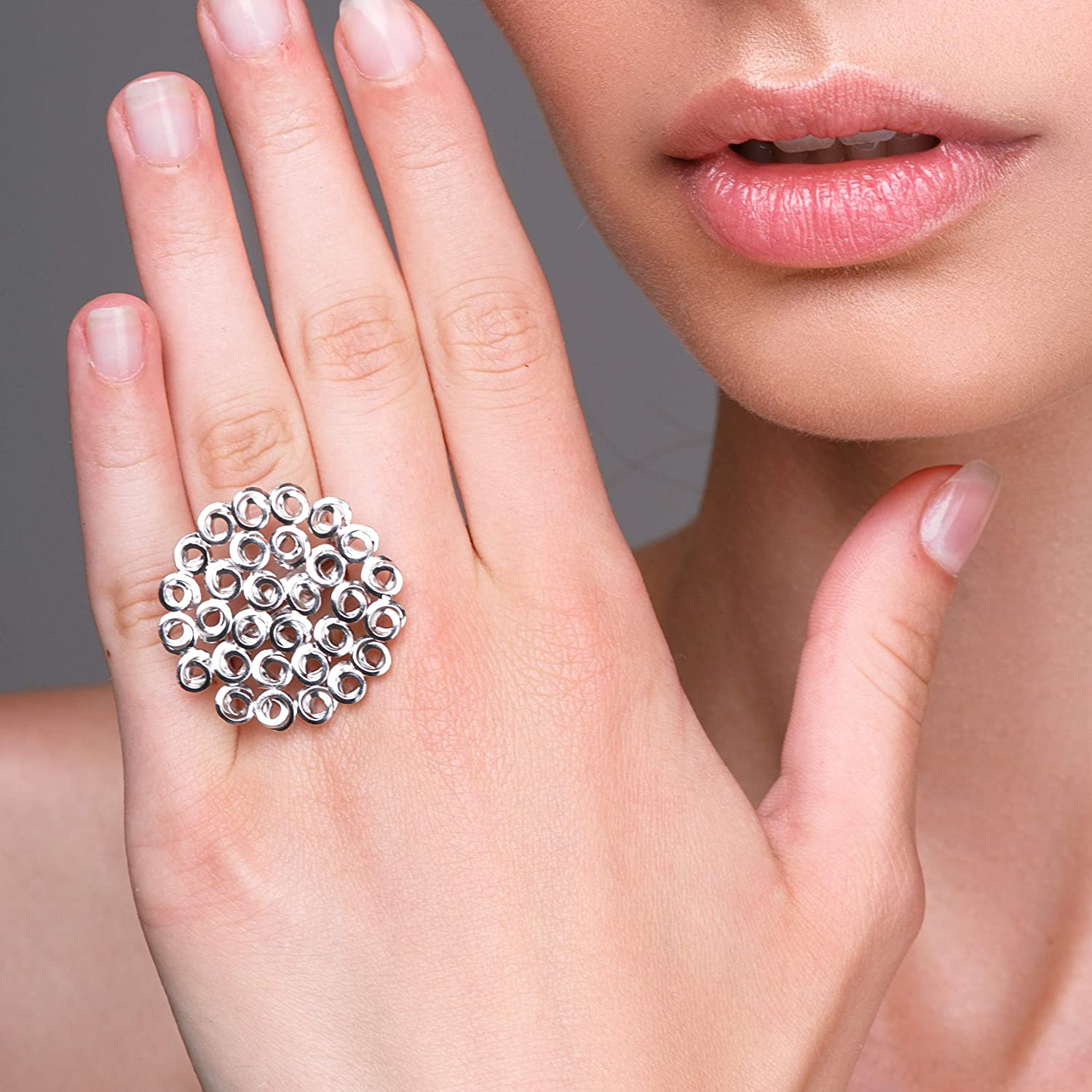 - Крупные кольца. Разные коллекции представляют кольца гротескной квадратной формы, большие камни, лучше всего с необработанными гранями. Отлично можно совместить предыдущие тренды в форме кольца, например, несколько разногабаритных колец, соединенных цепочками или кольца из крупных звеньев цепи идеально впишутся как в минималистичные, так и богемные и даже спортивные образы.