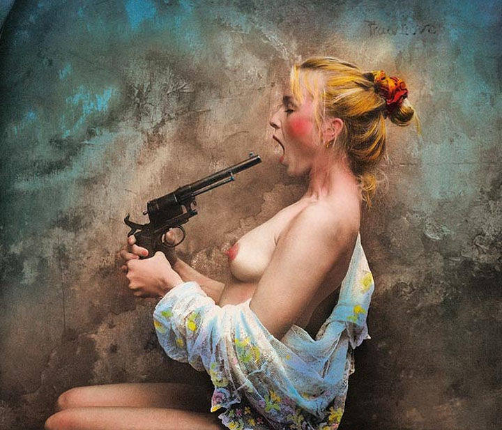 На самом деле все на грани: красивого и безобразного, эротичного и пошлого, вкусного и безвкусного. Удивляюсь, как художнику удается балансировать на столь тонкой грани. Среди выставленных в галерее работ — моя любимая фотография под названием «Пинок». На ней мужчина, похожий на Саудека, пинает ногой толстую кричащую тетку.