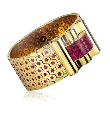 В 1920–30-е годы ювелирный дом Van Cleef & Arpels также завоевал репутацию одного из главных новаторов эпохи. Эмили Барбер из Bonhams считает, что трио браслетов, созданных в 1926 году – идеальный тому пример. Вместо бриллиантов – обязательного атрибута высокого ювелирного искусства того времени – они украсили изделия тремя видами полудрагоценных камней, что, конечно же, не осталось незамеченным. Между перидотами, цитринами и аметистами шестиугольной формы расположились небольшие камни в огранке «калибр» – новой технике, разработанной Van Cleef & Arpels для создания формы и текстуры отдельно взятого изделия. Даже металл, из которого выполнены украшения, можно считать инновационным. «Браслеты были сделаны не из платины, главного драгоценного металла того времени, а из золота с палладиевым покрытием, – говорит Барбер. – Оно было дешевле платины, а в сочетании с центральными полудрагоценными камнями свидетельствовало о том, что дизайн начинал цениться выше стоимости материалов».