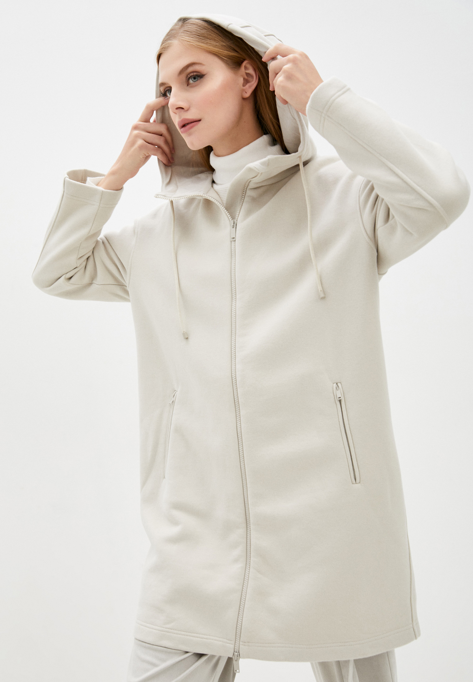 Пальто выполнено из толстовочного трикотажа. Модель прямого силуэта. Особенности: капюшон со шнурком, застежка-молния, боковые.