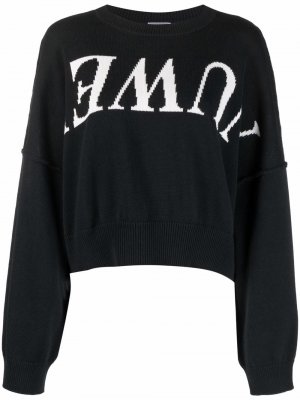 Логотип в технике интарсия, необработанные края, манжеты в рубчик, подол в рубчик, круглый вырез, приспущенные плечи и длинные рукава.