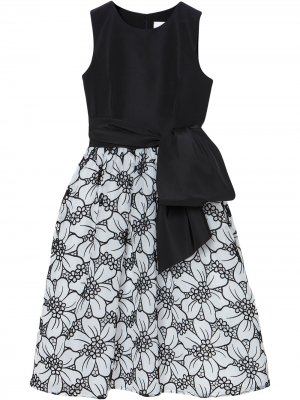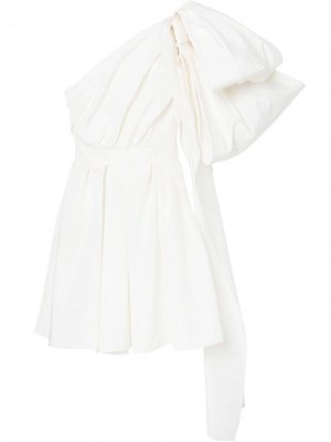 Женственное платье-миди из хлопка черного цвета от Carolina Herrera. Модель оригинально драпирована объемным бантом на плече. Приталенный силуэт с тканным поясом-лентой в тон, расклешенная юбка, короткие.
