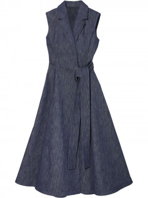 С запахом, расклешенная юбка, зазубренные лацканы, V-образный вырез, без рукавов, завязки спереди и длина миди.